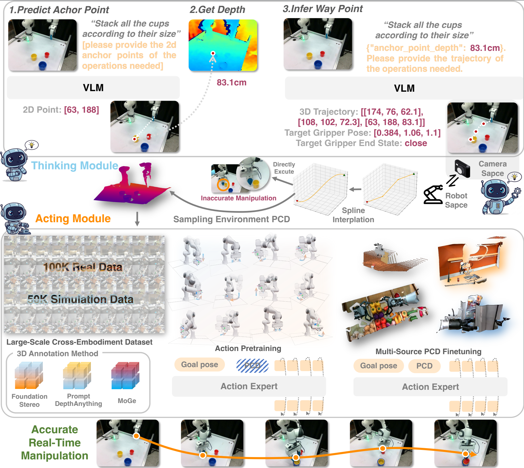 For simpler tasks, a powerful VLM might suffice on its own. But as complexity ramps up, the division of labor becomes crucial. The boundary between these two systems will be dynamic, shifting as the capabilities of each module evolve. On the most challenging tasks, the Reasoning model may fail to provide perfectly reliable guidance, and the Acting model may struggle to compensate for these upstream errors.
