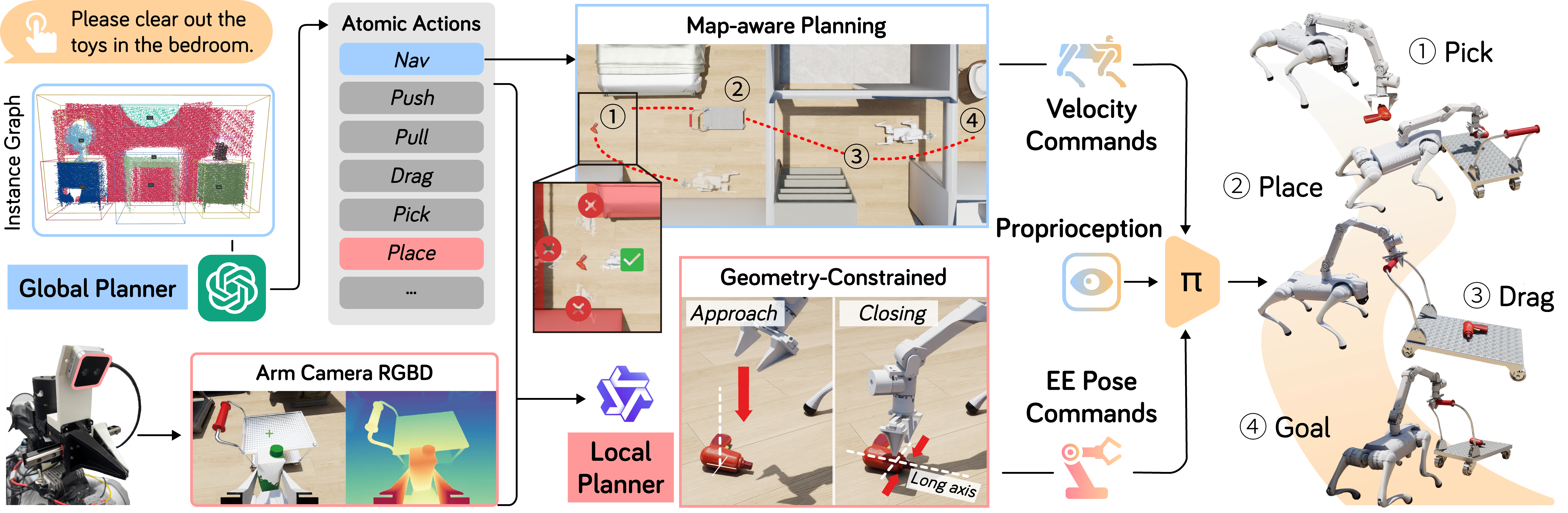Our pipeline spans the entire process of a long-horizon task, including multi-modal semantic perception, map-aware global planning, geometry-constrained action grounding, and step-wise execution by a reinforced-learned low-level whole-body policy.